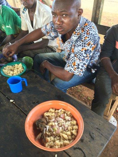 Attiéké的粘稠性較強,所以當(dāng)?shù)貥?biāo)準(zhǔn)的吃法是用手抓,黑人還喜歡在里面拌入西紅柿洋蔥肉塊等等,一塊兒用手抓,下圖是我以前拍的當(dāng)?shù)厝嗽陂_心地吃他的Attiéké。