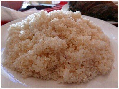 科特迪瓦最地道的主食自然是Attiéké,在網(wǎng)上找不到中文譯名。Attiéké簡單來說是把木薯捻碎了發(fā)酵成顆粒物的一種糧食,長相和口感都非常類似北非的小米飯古斯古斯,但是略有一點兒發(fā)酵的酸味,除此之外我覺得沒啥味道,個人不是太喜歡。