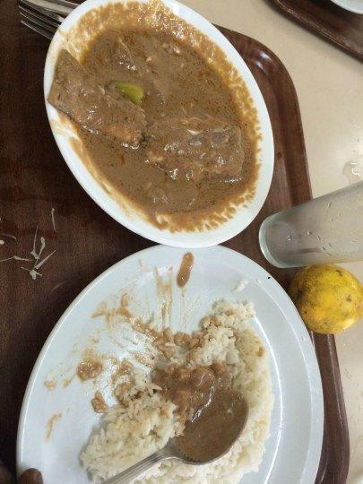 下面兩張是我中午在公司食堂吃的工作餐,算是典型的當(dāng)?shù)夭耍罢呤俏业牧?xí)慣,后者澆上醬汁是當(dāng)?shù)厝说牧?xí)慣。