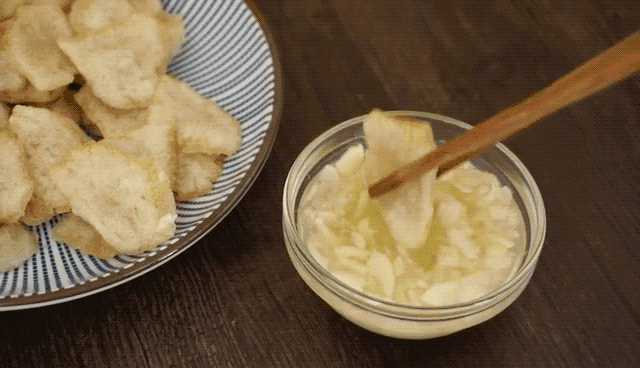 炸好的灌腸,蘸上用蒜粒和鹽水調(diào)和成的蒜汁,用牙簽扎著,一口一個(gè),噴香蹦脆,帶著解膩又提味兒的蒜汁兒,吃起來蕩氣回腸,越嚼越香。