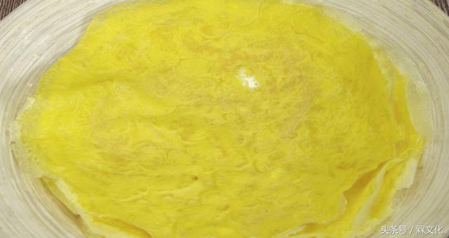 鍋中抹一層油,鍋熱后關(guān)小火,倒入蛋液,晃動(dòng)鍋?zhàn)?,讓蛋液均勻鋪開,等下層蛋液凝結(jié),這蛋皮子就完成了。
