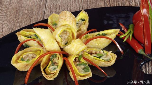 就用這樣做出的蛋皮子,包上餡料,蘸上面包糠或淀粉漿,下鍋一炸,這就是炸春段了。