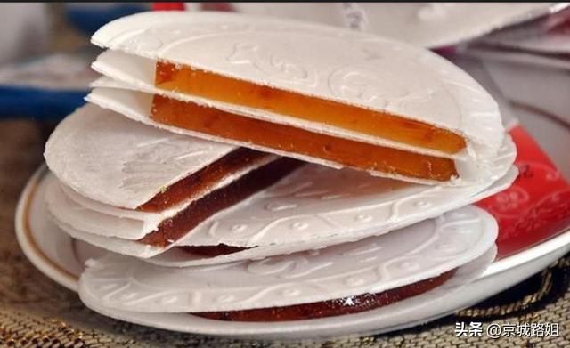 北京茯苓夾餅,是由茯苓粉加精面粉做成薄如白紙的小餅,中間加上蜂蜜砂糖和蜜餞松果碎等內(nèi)料,屬于一種宮廷滋補(bǔ)品。