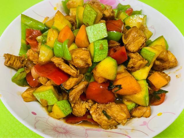 做法:熱鍋倒油,放入腌制好的雞肉?。缰品椒ǎ毫暇?、生抽、老抽、五香粉,小麥淀粉,攪拌均勻!)放入蔥姜蒜沫、干辣椒少許翻炒均勻,放入胡蘿卜丁、西葫蘆丁翻炒均勻,倒入少許開水,最后放入食鹽和青紅椒炒勻后關(guān)火出鍋!全家的最愛!