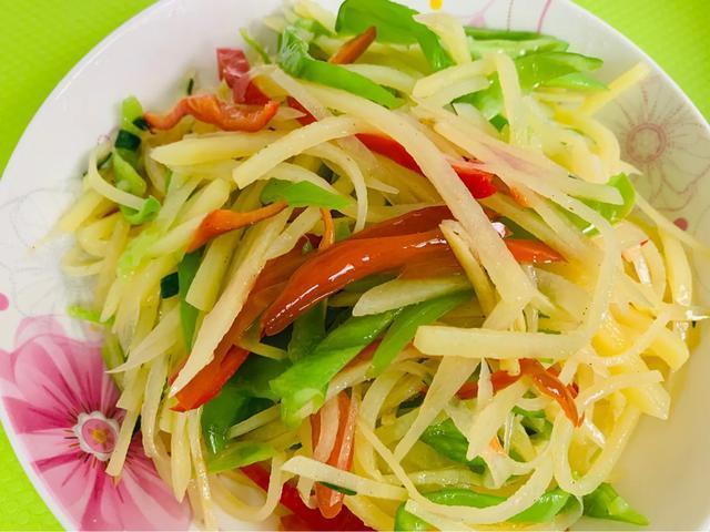做法:熱鍋倒油,放入姜蒜沫,炒出香味,放入用鹽水泡過的土豆絲,快速翻炒,倒入幾滴白醋或者米醋,翻炒均勻,放入青紅椒、蔥花、食鹽、五香粉翻炒均勻即可關(guān)火出鍋!顏值也頗高!方法簡單,效率也特別的高!好吃又下飯??!夾饅頭、包餅、配米飯都是不錯(cuò)的選擇!這道菜我很喜歡!