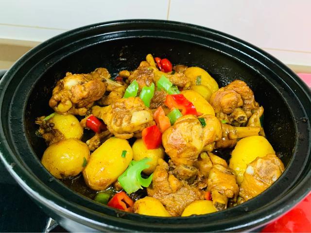 做法:熱鍋倒油,放入腌制好的雞腿(腌制方法(料酒、生抽、老抽、蠔油、)翻炒,炒至汁還有一點(diǎn)的時(shí)候,放入蔥姜蒜沫,繼續(xù)翻炒,然后加入開水,水位大概和雞腿齊平的位置,蓋上蓋子燒!燒至湯汁還有一半左右時(shí),加入食鹽攪拌均勻,再放入土豆,繼續(xù)蓋蓋子燒,待土豆和雞腿都熟了以后,撒入青紅椒點(diǎn)綴即可關(guān)火出鍋!這樣燒出來的雞腿特別的香!