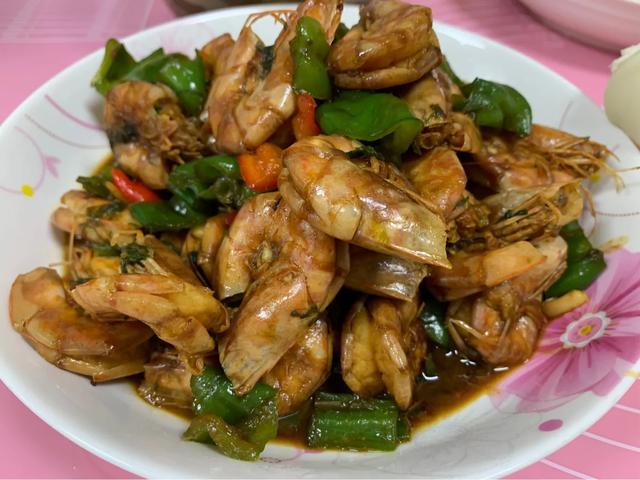 做法:熱鍋倒油,放入蔥姜蒜,炒出香味,放入對(duì)蝦(對(duì)蝦已去蝦線),放入一點(diǎn)點(diǎn)醋,去腥味!放入生抽、老抽,加入清水,食鹽,蓋上蓋子大火開,轉(zhuǎn)中火燒,待湯汁還剩一半時(shí),放入青紅椒,繼續(xù)燒,待湯汁還剩一點(diǎn)時(shí),撒入五香粉,攪拌均勻即可關(guān)火出鍋!