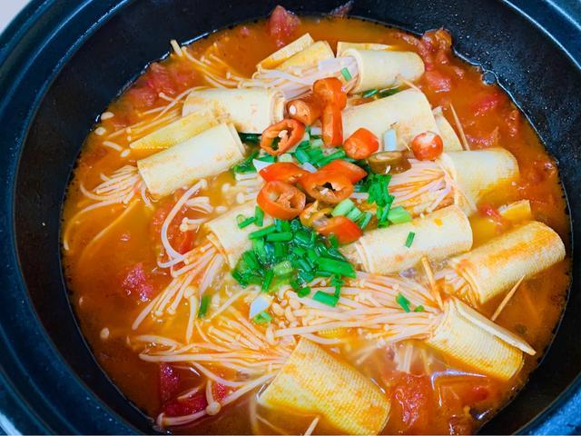 做法:熱鍋倒油,放入西紅柿丁翻炒,加一勺食鹽,炒出濃濃的湯汁后加入清水,大火燒開后,放入金針菇小卷,蓋上蓋子繼續(xù)燒大概10分鐘左右吧,然后放入食鹽、用鏟子輕輕推動(dòng)底部,最后撒入蔥花、小米辣圈點(diǎn)綴即可!這道菜也是我女兒的大愛!