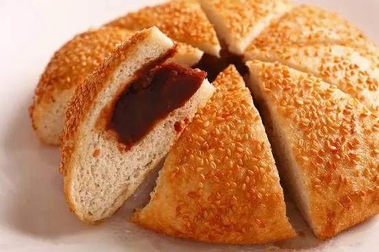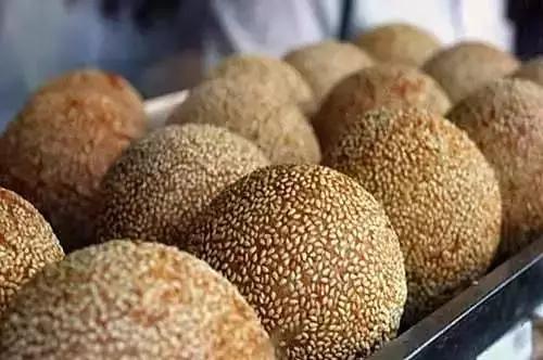 又名黃金大麻餅,發(fā)好的圓形面餅上籠蒸熟后,撒上芝麻,過一下油出鍋。表面松脆,內(nèi)里松軟多孔,一層層的。一般無餡,也有豆沙和棗泥的。