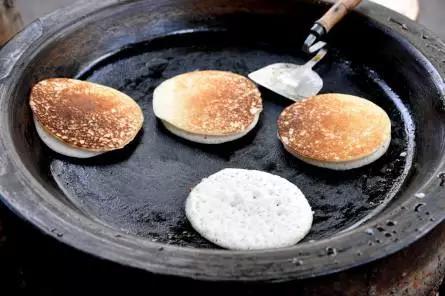 大米粉調(diào)成糊,略發(fā)酵,傾倒米漿放在大平底鍋的中央凹處,中火,蓋蓋烘烤10分鐘即成,底面金黃,面白,略略甜中帶酸。現(xiàn)在有些米飯餅還會加入酒釀,一股酒釀香,配上油條,也是出奇的搭。
