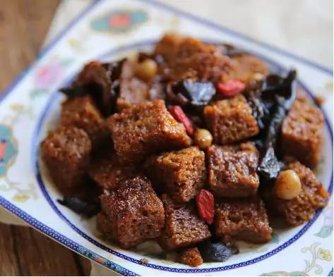 烤麩要先過水,再油炸下,下鍋同醬油、八角、茴香;花生仁、黑木耳、扁尖筍、金針菜(四喜)同燒,最后加鹽和白糖出鍋,冷熱皆可食用。