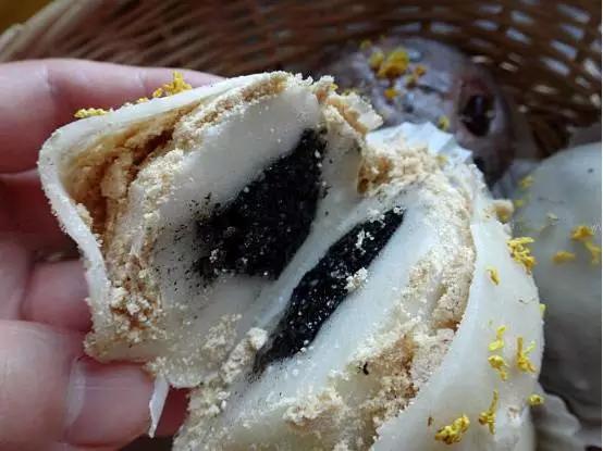 雙釀團的所謂雙釀是指一團包兩餡,上海以豆沙餡和芝麻餡疊用,每個糕團劑子先包豆沙,攏口后再包芝麻餡。成品透明,隱約可見豆沙餡心,甜糯香美。