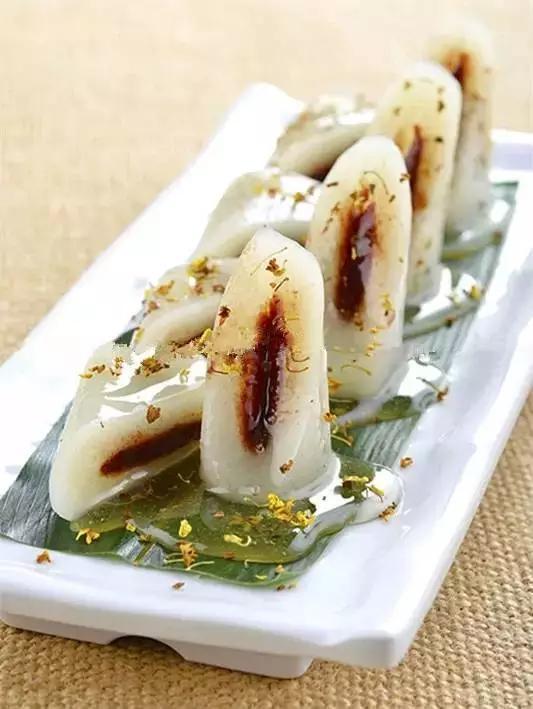 將白糖用熱水溶化,放入糯米粉中調(diào)制成糊狀,倒入涂過油的盤內(nèi),上籠蒸熟,冷卻后撒上白糖、桂花,切成菱形小塊即成,色澤玉白,香甜糯滑。城隍廟綠波廊餐廳名點。