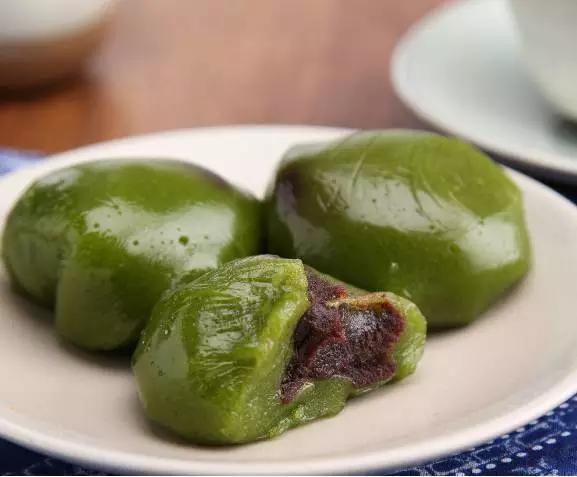 青團是清明節(jié)時令小吃,亦是寒食節(jié)的傳統(tǒng)冷食,青團用漿麥草汁或青艾汁或綠色蔬菜汁和糯米粉搗制再以豆沙餡或芝麻餡而成,蒸熟出籠時用毛刷將熟菜油均勻地刷在團子的表面,青團碧青油綠,糯韌綿軟,甘甜細膩。