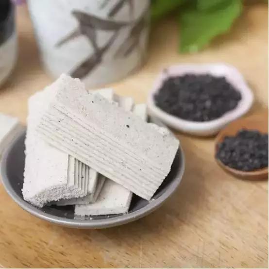 云片糕的糕粉很講究,糯米要碾去米皮,留下米心。磨得極細,連續(xù)過篩,綿細如面,炒熟,且要保持白凈,然后存放半年后拌合極細的砂糖使用。摻合豬油、欖仁、芝麻、香料拌勻,壓縮成形。最后由鋒利的大方刀,切成片片,薄如書頁即成。