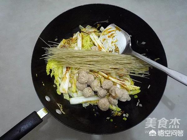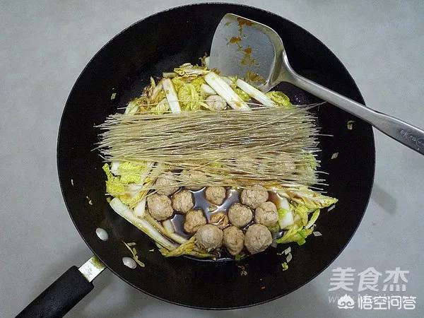 6.拌勻后加入肉丸和紅薯粉絲。(我用的紅薯粉絲比較細(xì),沒有提前泡,如果用粗粉條需要把粉條泡軟)
