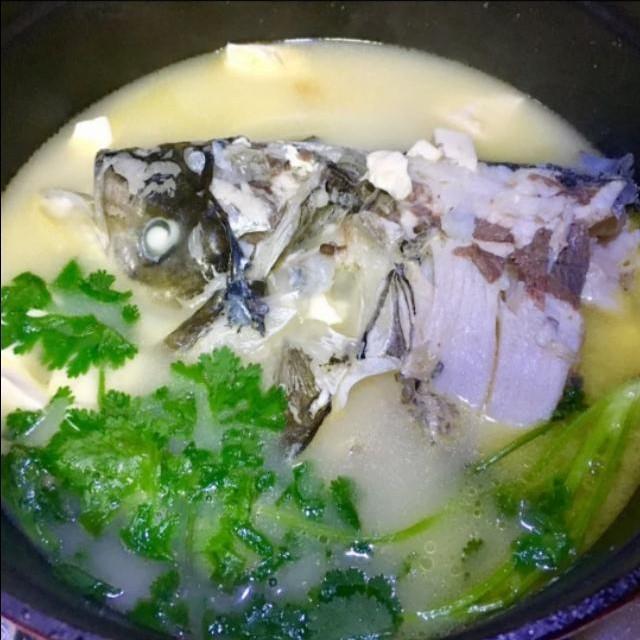 步驟五,魚湯變白時,出鍋時撒上香菜。