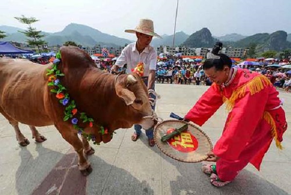 3、牛魂節(jié):時在農歷四月初八。又稱脫軛節(jié),流行在桂北龍勝一帶壯族山村。傳說這天是牛王誕辰。要給牛脫軛,刷洗身子,放牧到水草豐美的地方。牛欄要打掃干凈,鋪上干爽稻草。不準役使,更不準鞭打,還要給牛唱山歌,喂烏米飯。過去有些寨子里還建有牛魔王廟,過節(jié)這天,要殺豬祭祀,村民們在廟里聚餐。
